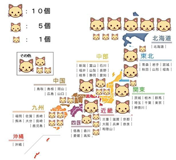 2014年3月9日現在、153個ありました。 地域別に集計したところ、東日本に偏っていました。特に、出身地である北海道が圧倒的に多く、次いで現在住んでいる関東が多くなっています。